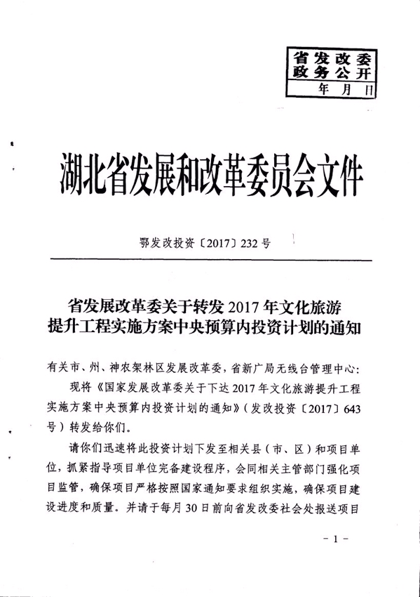 省發(fā)改委關于轉發(fā)2017年文化旅游提升工程實施方案中央預算內(nèi)投資計劃的通知