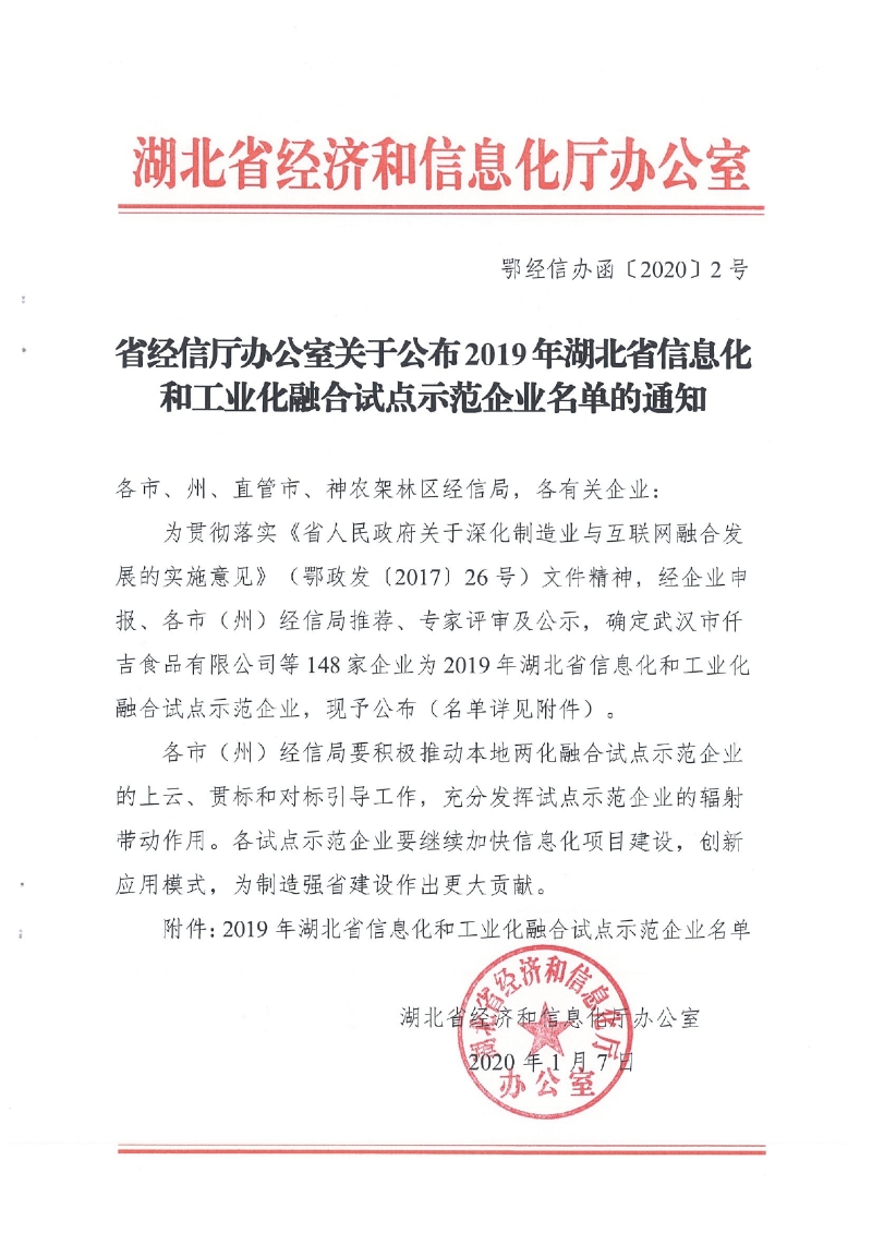 省經信廳辦公室關于公布2019年湖北省信息化和工業化融合試點示范企業名單的通知